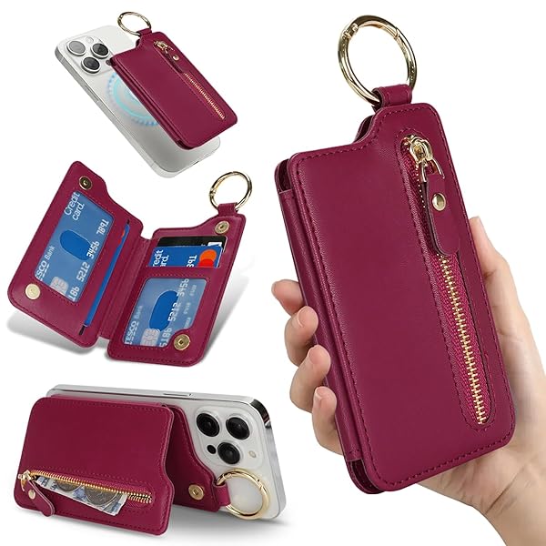 カードケース magsafe カード入れ スタンド機能 ジッパー 小銭入れ リング付き 3枚カード収納可能 iPhone 16 Pro Max/16 Pro/16 Plus/16、iPhone 15/14/13/12シリーズ対応-スカーレッド