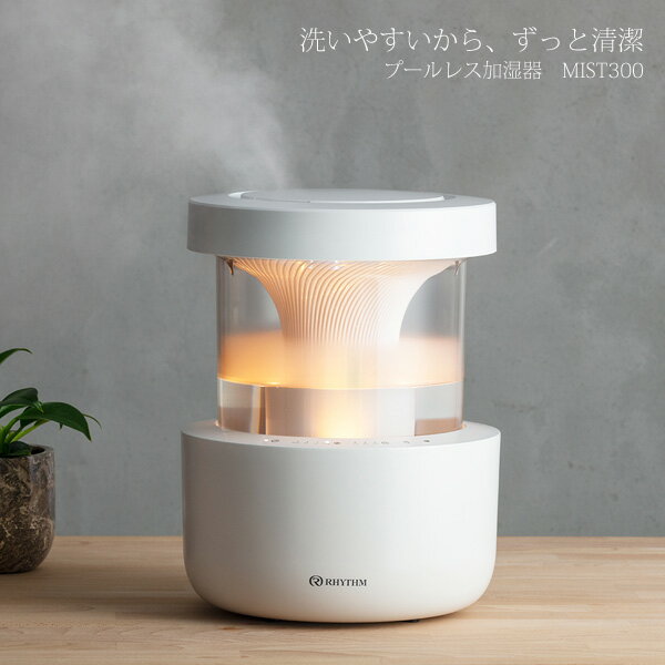 リズム時計 【プールレス加湿器 MIST(ミスト)300】 洗いやすいから、ずっと清潔 【洗いやすい、くつろぎの加湿器】 快適な湿度とくつろぎの時間を提供する超音波式プールレス加湿器です。 毎日「新鮮で綺麗な水」で加湿できるように、洗いやすさ、使いやすさを一から見直しました。 「水」が「霧」になり「湿度」に変化する一連の流れをあかりとともに演出。 【パブリックな空間を加湿】 リビングや寝室などで使用できる省電力の超音波振動式加湿器です。 「デュアル圧電素子テクノロジー」を採用することで、水位が可変しても安定して加湿ができ、タンク内に圧電素子を入れる事で完全なプールレス化を実現しました。 吹き出し口は水平方向に360°回転できるよう設計。 部屋のどの位置にも置きやすく、家族が集まるリビングなどのパブリック空間を加湿します。 【シルクのような霧とあかりの演出】 シルクのような霧と、それを照らす暖色のあかりは、空間を加湿するだけでなく、くつろぎの時間を演出します。 加湿が始まるたびに雲海のような霧がタンク内にたまり、小さな水の粒が集まり浮遊する様子は、山深い湖で霧が発生し揺れ動く小世界を覗いているようで見飽きることがありません。 運転モードを「Fog(フォグ)」に設定すると、繰り返し霧が溜まる様子をお楽しみいただけます。 【使いやすく清潔】 加湿器は水を空気中に放出し、湿度を調整する道具です。 さまざまな方法が模索されていますが、加湿器を清潔に保ち、毎日「新鮮で清潔な水」を入れ加湿することが最重要です。 今までの加湿器は部品点数も多く複雑な形状で洗いにくく、水や湿気が触れるすべてのパーツを衛生的に保つことが困難でしたが、MIST 300は水や湿気が通るすべてのパーツを簡単に洗うことができます。しかもたった3つのパーツを洗うだけ。 これは加湿器の使い勝手の革命です! プールをなくしタンクだけで加湿ができるため、タンクだけを取り出して簡単に洗浄・給水できます。 MIST 300は水の入れやすさ、洗いやすさ、使いやすさを考え抜いた加湿器です。 【快適な湿度】 快適な湿度40〜60% の範囲を維持しウィルスやカビが発生しやすい乾燥・多湿状態を防ぐことが重要です。温湿度センサーにより賢く自動運転を行います。 【安全と省エネと静音】 気化式とは異なり温度・湿度に影響されず、スチーム式のように熱による火傷の心配も無い安全な超音波式を採用。DCモーターと併用をし省エネながらも十分な加湿が行えます。 また、動作音も23dBでおやすみ中も眠りを妨げない静かさで快適にうるおいます。 ギフトにもおすすめ!☆ラッピングサービス☆彡 機能/スペック ●電源:専用AC電源アダプター(付属) ●入力:AC100V 50/60Hz ●出力:DC12V 1.0A ●加湿方式:超音波振動加湿方式(日本製デュアル圧電素子採用) ●加湿量:Hi:約300ml/h 、Low:約150ml/h ●タンク容量:約2.2L (残水0.4L) ●連続加湿時間:Hi:約6h ・ Low:約12h ●運転モード:4段階(Auto/Hi/Low/Fog) ●照明:LED(明るさ3段階切替+OFF ※室内の明るさにより自動減光機能付) ●適用床面積:木造和室 8平方メートル(5畳)、プレハブ洋室 14平方メートル(8畳) ●サイズ:直径256mm×高さ333mm×奥行256mm ●重さ:約3kg(AC電源アダプター含まず) 【付属品】 ACアダプター/お掃除ブラシ/取扱説明書・保証書 ◆他、加湿器は【こちらへ】 ■ギフト用にラッピング致します(無料) ■【買い物かごに入れる】ボタンをクリックするとご注文できます。 2211 ※発売時期、画像、商品仕様はメーカーカタログに基づいて掲載しています。 メーカーの都合により変更になる場合がございます。予めご了承下さい。