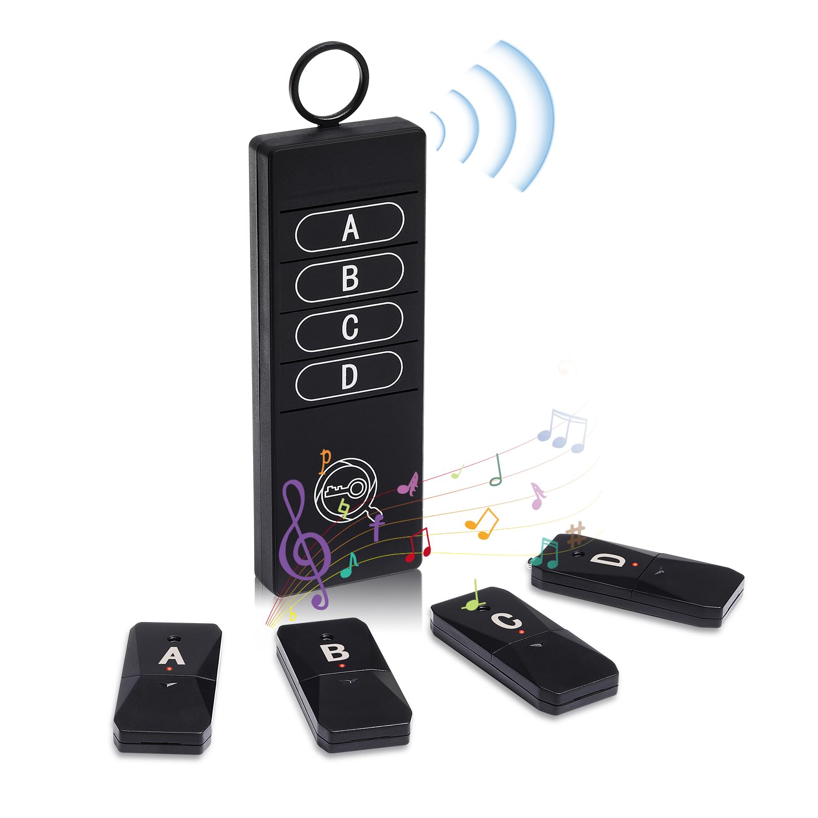 【2024最新版4in1キーファインダー】送信機(1台)にはA/B/C/Dの番号ボタンがあり、送信機のボタンを押すと同じ番号の受信機(4個)が鳴ります。ワンタッチだけで、うっかり紛失してしまいがちな貴重品を素早く見つけることができるし、落とし物や忘れ物の不安から解放!手のひらに収まる携帯性、シンプルな操作性、違和感なくインテリアに馴染むデザイン性も追求しました。【大音量・感知距離抜群】従来品よりも音量が70dBから85dBに上がり、なくしたものを素早く探せる!強い無線周波数が壁、床、クッション、革製品などを通回すことができます。受信範囲は約30-50Mで、家の中でよく使うものにつけたいときに向いています。壁や床、クッション、革製品などの障害物の影響を受けにくく、隣や階上の部屋での使用も可能です。【受信機:CR2032長寿命電池】従来品より電池の使用時間が50%増加し、最長1年間使用できます。分解して取り付けて、簡単に操作します。キーファインダーの受信機を改善されて、効果的にバッテリー効率を向上させ、より長い使用時間を提供することができます。【キーリング/粘着シール・2Way式】キーホルダーと固定用粘着シール付き、受信機を鍵、携帯、リモコン、財布、眼鏡、鞄など忘れやすいものに取り付けあるいは粘着することが出来ます。【スマホなしで操作が簡単!】設定一切不要で、複雑な操作が苦手なご年配の方やお子さんにおすすめの忘れ物防止キーファインダー。電池交換が簡単、ボタンが大きく、数字タグは覚えやすく、お年寄りにもやさしい各種機能を搭載しています。【パッケージ内容】送信機*1(ご注意:本製品はバッテリーは含まれません。)、受信機(コイン電池は含付属しています)*4、キーリング*4、粘着テープ*4、壁掛けフック*1、日本語取扱説明書*1。