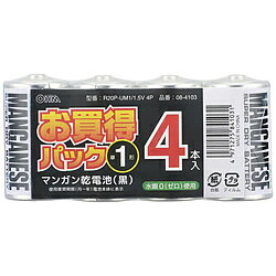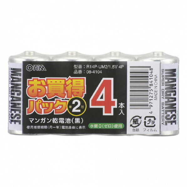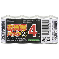 オーム電機 マンガン乾電池 単2形(4本入パック) R14P-UM2/1.5V 4P2 [R14PUM215V4P2]