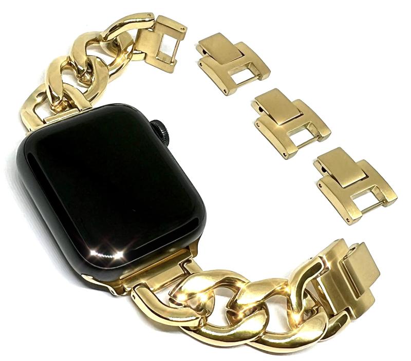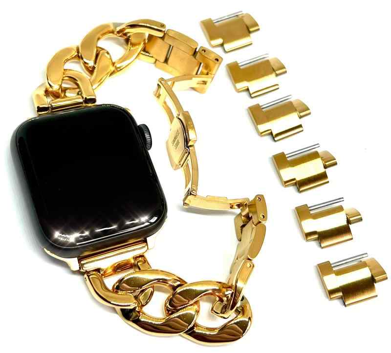 Royce&Roland Apple watch チェーンバンド/バタフライバックル (40mm 41mm 42mm / 44mm 45mm 46mm 49mm) おしゃれ アップルウォッチ 時計 バンド ベルト/ステンレス (Series 11 10 9 8 7 6 5 4 SE Ultra) レディース メ【全機種対応】対応機種:Apple Watch Series 11 , 10 , 9 , 8 , 7 , 6 , 5 , 4 , SE ,Ultra 3.2.1 /サイズ:40 . 41 . 42 . 44 . 45 . 46 . 49mm対応 / ご希望のサイズをお選びください。 / 付属品:輸送用ボックス、コマ調整説明書 アップルウォッチ本体は付属しません。ゴールドカラー、ピンクゴールドカラーはチェーンが重なり合う部位は塗装が薄れシルバーに近い色味となりますが、不良品ではございません。装着時には露出しない部位となります。コマ調整の際は、コマサイドのパーツを真っ直ぐ引き出し回転させて下さい。【高級感溢れるバンドで華やかに】チェーンベルトがキラキラ輝くデザインで、一段と上品な雰囲気を演出します。手首につけるだけでオシャレ度がグッと上がり、着けていても違和感のない重さなので、ビジネスからカジュアルな場面まで幅広いシーンでお使いいただけます。【装着も楽々】高級時計にも用いられるバタフライバックルを採用。ベルト側面のボタンを押すだけで片手でもスマートに開閉でき、スピーディーに着脱できるので忙しい朝でもサッと着用可能です。使い勝手抜群なので、爪が柔らかい方やジェルネイルも傷つける心配がありません。【ステンレススチールを採用】合金ではなくステンレススチールを用いたチェーンブレスレット。ステンレススチールの磨き上げられた美しいデザインが特徴で、チェーンはポリッシュ加工、コマは高品質サテンで仕上げています。リング状のチェーンは通気性も抜群です。【コマ調整器が不要】コマ調整器がいらず、コマを引っ張って捻るだけで簡単に調節が出来ます。ベルトの裏面を矢印の方向へコマを引っ張り、回転させることでコマが外れます。取り扱い説明書付き。腕周り約14.5cmから対応します。【必ずお読みください】 1.ステンレスは金属アレルギーを起こしにくい素材ですが、体質によって、かゆみ・かぶれを生じる場合がありますので、皮膚に異常を感じたときは、ご使用をお止めいただき専門医にご相談ください。金属アレルギーが心配な方は、皮膚科にてパッチテストなどのアレルギーテストを受けられることをおすすめします。ご購入後のアレルギー反応に関しまして責任は一切お受け出来かねます。あらかじめ、ご了承ください。金属アレルギーの方はご使用しないで下さい。 2.力仕事や激しいスポーツをする時、就寝時や幼児の世話をする時など、身体に危害を及ぼす場合がありますのでジュエリーをはずしてください。 3.サウナ等高温の場所、あるいはスキー場等極寒地でのピアスなどのジュエリーの使用は、火傷、凍傷の原因となる場合がありますので、着用しないでください。