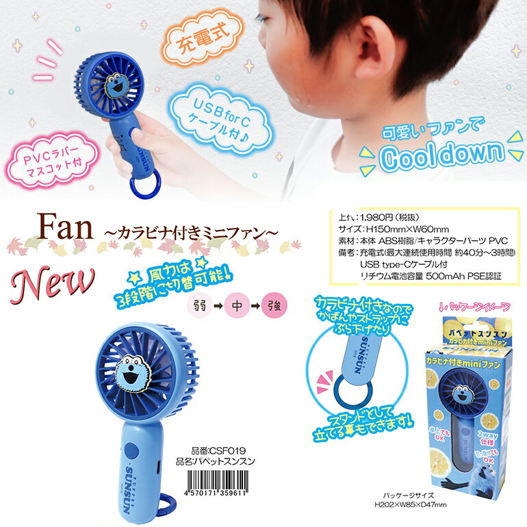 パペットスンスン ハンディファン ミニ 扇風機 カラビナ 2way スタンド 手持ち 卓上 小型 夏 熱中症対策 暑さ対策 風量3段階 充電式 Type-C ケーブル キャラクター かわいい 旅行 レジャー キャンプ 海水浴 プール 散歩 部活 通園 通勤 通学 csf019