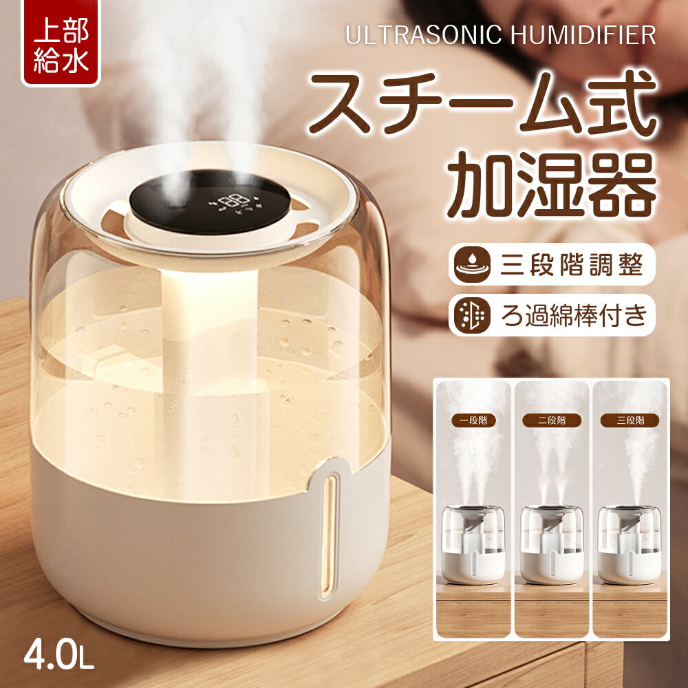 加湿器 小型 卓上 大容量 4.0L 3段階ミスト調節 3W 節電 540g 湿度測定 おしゃれ 加湿器 USB給電式 上部給水 ろ過綿棒 アロマ ナイトライト 空焚き防止 省エネ 静音 最大20H お手入れ簡単 花粉対策 空気清浄 寝室 家庭用 オフィス用 ホテル用 持ち運びやすい 誕生日 ギフト