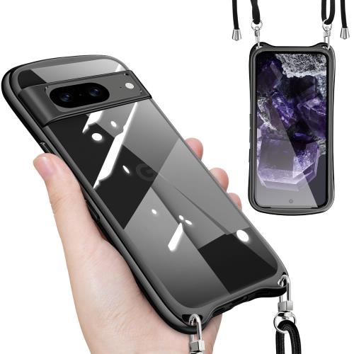 Google Pixel 8 ケース クリア ショルダー ストラップ付き グーグル ピクセル8 カバー 透明 肩掛け 縄掛け 斜めかけ TPU メッキ加工 耐衝撃 全面保護 薄型 韓国 可愛い スマホケース (ブラック)
