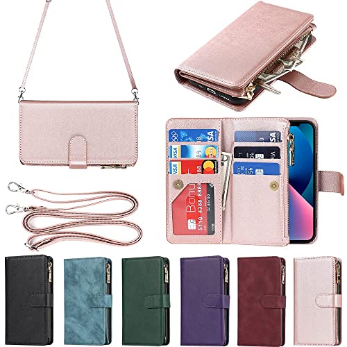 Eastwave アイフォンiPhone 13 ケース 縄掛け 手帳型 財布型 ICカード コインポケット ストラップ付き カード 収納 小 銭入れ ファスナーポケット付き PUレザー 6色 ピンク