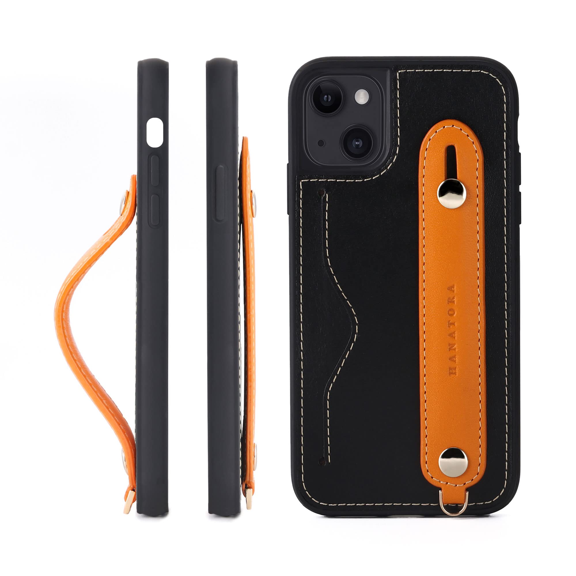 [HANATORA] iPhone13 ケース 本革 グリップケース レザー ストラップ付属 イタリア製牛革 ヌメ革 片手操作 カード収納 スタンド機能 メンズ レディース ブラック/オレンジ CGH-13-Black-OG