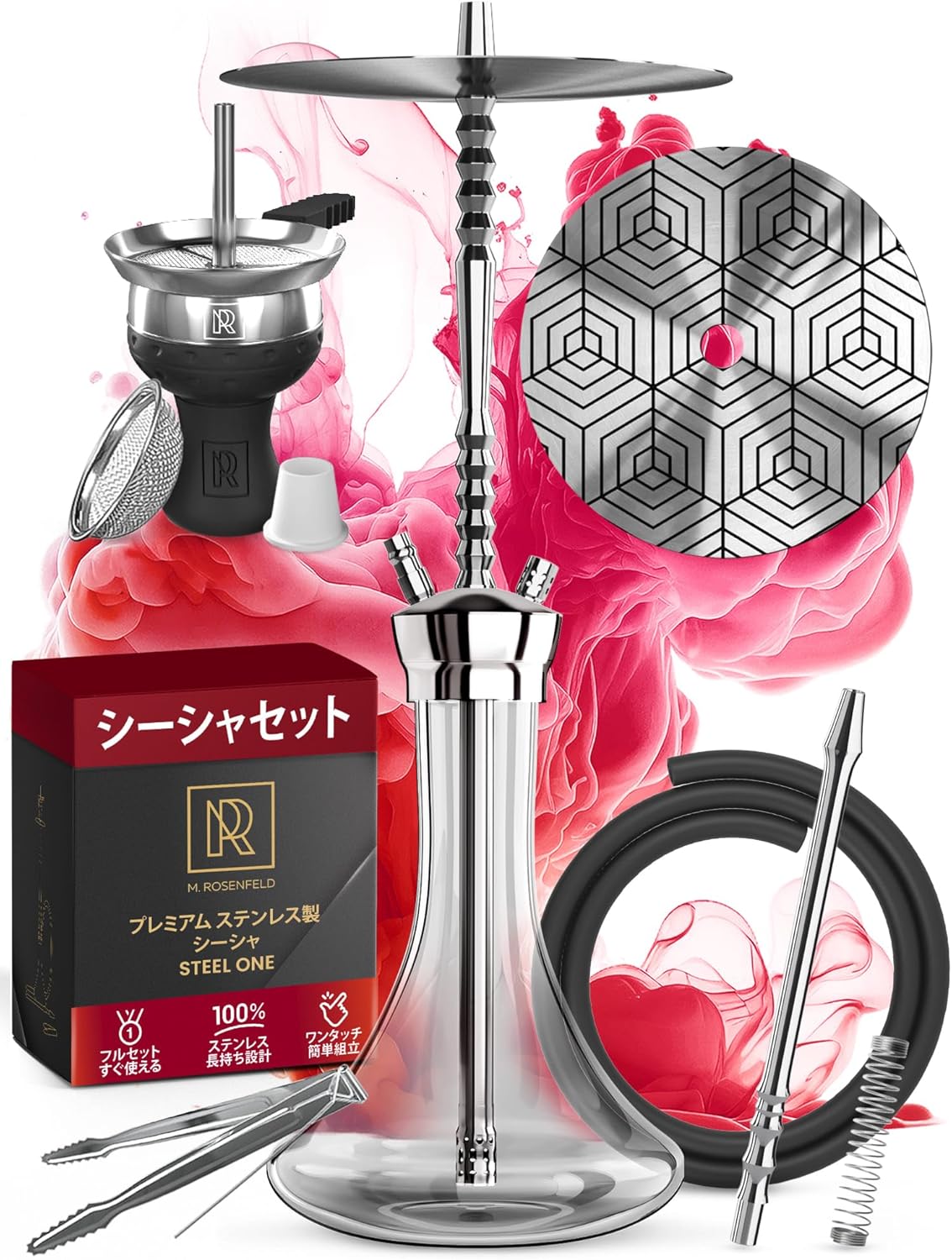 シーシャ 本体セット Steel One 70cm - ワンクリックロック搭載 シーシャ セット シーシャ 自宅用・商業用 クレーヘッド チムニー シリコンホース&マウスピース付 クリスタルベース 静音ディフューザー 高耐久 厚底シーシャ 台 プレミアムデザイン プロ M. ROSENFELD