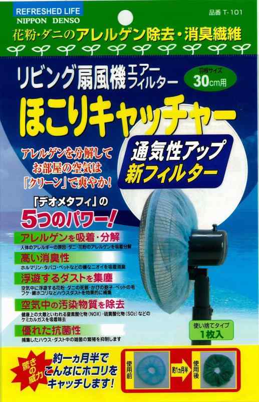 日本デンソー(Nippon Denso) 扇風機エアーフィルター ほこりキャッチャー デオメタフィ T-101サイズ:19.5×118×0.15cm本体重量:10g本体:ポリエステル・レーヨン・フタロシアニン化合物・合成ゴム・ポリプロピレン日本羽根サイズ30cm用1枚入「デオメタフィ」は、人体のアレルギーの原因物質(ダニ・花粉)アレルゲンを吸着・分解するとともに、高い抗菌・消臭効果を長時間持続します。