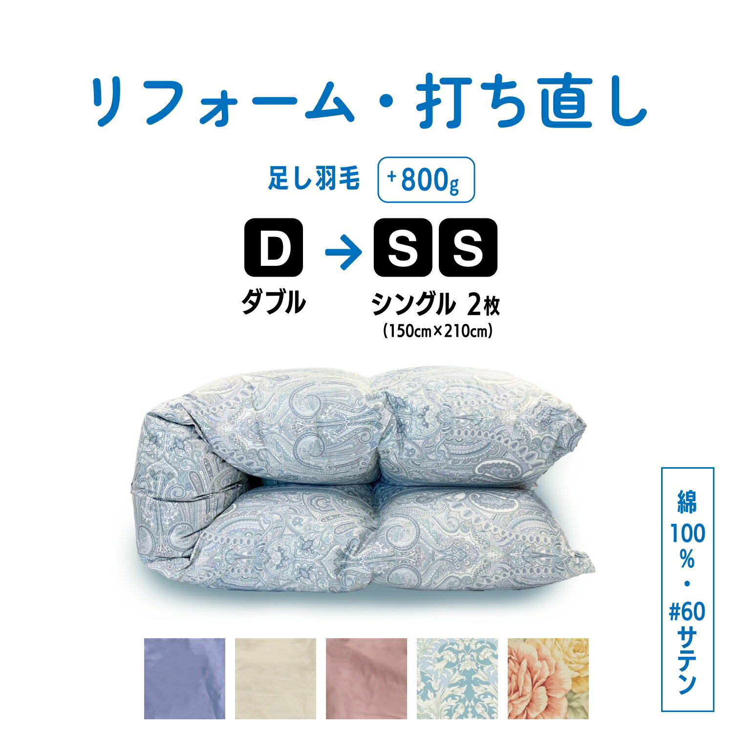 【ふるさと納税】 羽毛ふとん リフォーム ダブル 1枚 → シングル 2枚 リサイズ 【 選べる カラー 】 / 綿 100% 60 サテン | 寝具 布団 ふんわり ふっくら 個別管理 リサイズ ふとん フトン 調布 東京都送料無料 ピンク ブルー アイボリー 柄あり