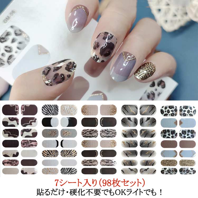 7シート入り(98枚セット)貼るだけ・硬化不要でもOK ライト でも! サイズ 7シート入り/ヤスリ付き サイズについての説明 7シート入り(98枚セット)【ご使用前に】●爪に油分や水分、汚れが付着しているとシールが剥がれやすくなりますので、爪の表面をキレイに拭き取ってください。●甘皮を処理し、付属のファイルなどで爪の形や表面を整えるとよりキレイに仕上がります。●シートからネイルシールを剥がす際にはシートの外側部分を持って剥がしてください。(1)製品を爪に合わせ、爪よりも少し小さめのネイルシールをお選びください。(2)キューティクルラインと1mmほどの余裕があるところにネイルシールを貼ってください。(3)ネイルシールを貼って余りのシールは爪の形に合わせて折ってください。ファイルを利用して、爪の下の方向に向けて余りのネイルシールを削ってください。(4)お好みの硬化方法を選んでください。・寝る前に貼り硬化する場合・自然光で硬化する場合:約2時間(自然光が多い室内と室外にて)・UV&LEDライトで硬化する場合:約30秒【剥がし方】●ウッドスティックでキューティクルラインからゆっくり押出しながら剥がしてください。※剥がしにくい場合はお手持ちのハンドクリーム等を塗ると効果的です。・UV&LEDライトで硬化すると自然光で硬化するよりも剥がしづらい可能性があります。 素材 エゴ樹脂 色 01+02+03+04+05+06+07 08+09+10+11+12+13+14 備考 ●サイズ詳細等の測り方はスタッフ間で統一、徹底はしておりますが、実寸は商品によって若干の誤差(1cm〜3cm )がある場合がございますので、予めご了承ください。 ●製造ロットにより、細部形状の違いや、同色でも色味に多少の誤差が生じます。 ●パッケージは改良のため予告なく仕様を変更する場合があります。 ▼商品の色は、撮影時の光や、お客様のモニターの色具合などにより、実際の商品と異なる場合がございます。あらかじめ、ご了承ください。 ▼生地の特性上、やや匂いが強く感じられるものもございます。数日のご使用や陰干しなどで気になる匂いはほとんど感じられなくなります。 ▼同じ商品でも生産時期により形やサイズ、カラーに多少の誤差が生じる場合もございます。 ▼他店舗でも在庫を共有して販売をしている為、受注後欠品となる場合もございます。予め、ご了承お願い申し上げます。 ▼出荷前に全て検品を行っておりますが、万が一商品に不具合があった場合は、お問い合わせフォームまたはメールよりご連絡頂けます様お願い申し上げます。速やかに対応致しますのでご安心ください。