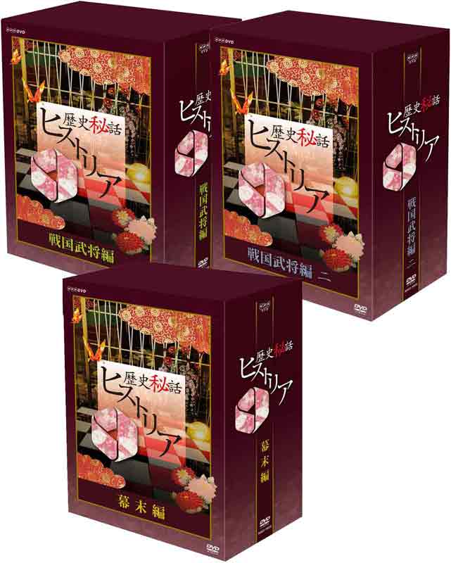 『歴史秘話ヒストリア 戦国武将編 一と二と幕末編のセット DVD-BOX』 各巻 メーカー希望小売価格:19,000円+税 【セット内訳】 戦国武将編 品番:NSDX-16923 2010年/日本 DVD 5枚組 各巻約42分 戦国武将編 武田信玄 戦国武将編 毛利元就 戦国武将編 上杉謙信 戦国武将編 織田信長 戦国武将編 豊臣秀吉 戦国武将編 二 品番:NSDX-16935 2009、2011年/日本 DVD 5枚組 各巻約42分 戦国武将編 二 伊達政宗 戦国武将編 二 直江兼続 戦国武将編 二 真田幸村 戦国武将編 二 織田信長 戦国武将編 二 徳川家康 幕末編 品番:NSDX-16929 2009、2010、2011年/日本 DVD 5枚組 各巻約42分 幕末編 新選組 幕末編 高杉晋作 幕末編 坂本龍馬と中岡慎太郎 幕末編 勝海舟 幕末編 西郷隆盛 出演:渡邊あゆみ 音楽:梶浦由記 毎週水曜日 22時〜 NHK総合にて放送 【スペック】 ドキュメンタリー/セル/210分/5枚組/16:9/ステレオ・ドルビーデジタル/片面一層/カラー/チャプター付/トールサイズ 企画・制作:NHKプラネット近畿 発行・販売:NHKエンタープライズ (C)2012 NHK 「戦国武将編」 【解説】 教科書には載らない、しかしそこに確かに生きた人々の秘められた想いの物語、すなわち“秘話”の数々を紹介し、歴史の奥深さや面白さを追求する。史実に基づいた意外な人生の物語を、日本史1800年分、丸ごと楽しむ新しい歴史ドキュメンタリー。なかでも、人気が高いテーマ「戦国武将編」をリリース!! 歴史秘話ヒストリア 【内容】 戦国武将編 武田信玄 こんなBOSSならついていきたい!悩んで迷って大きくなった エピソード1 わたし 占いで人生変えました エピソード2 信玄プリンセスの結婚物語 エピソード3 信玄 最後のイリュージョン 戦国武将編 毛利元就 家族って大変だ!? 戦国武将の秘密の悩み エピソード1 子どもの個性を生かせ! 元就の勢力拡大作戦 エピソード2 「兄弟は団結せよ!」父の教えが逆効果・・・!? エピソード3 団結へ— 毛利一族の皮肉な運命 戦国武将編 上杉謙信 謙信、変身! 悩める若者、ヒーローになる エピソード1 謙信逃亡! 27歳の告白 エピソード2 謙信、一騎打ち! 32歳の苦悩 エピソード3 「謙信」誕生 41歳の出会い 戦国武将編 織田信長 女中は見た!! 本能寺の変・信長最後の3日間 エピソード1 公家は見た! 信長最後のパフォーマンス エピソード2 女中は見た! 信長涙のメッセージ エピソード3 僧侶は見た! 信長 遺体の謎 戦国武将編 豊臣秀吉 必勝!手紙・メール術 私はこれで天下のハートをつかみました エピソード1 秀吉流“人の口説き方”教えます エピソード2 前略、おね様 出張先から愛妻へ・・・ エピソード3 愛しの秀頼様へ 子ぼんのうが招いた悲劇 「戦国武将編 二」 【解説】 教科書には載らない、しかしそこに確かに生きた人々の秘められた想いの物語、すなわち“秘話”の数々を紹介し、歴史の奥深さや面白さを追求する。史実に基づいた意外な人生の物語を、日本史1800年分、丸ごと楽しむ新しい歴史ドキュメンタリー。人気が高いテーマ「戦国武将編」第2弾をリリース!! 歴史秘話ヒストリア 【内容】 戦国武将編 二 伊達政宗 いつも崖っぷちだった 独眼竜の世渡り人生 エピソード1 俺の目玉くれてやる!独眼竜誕生の秘密 エピソード2 開演!決死のパフォーマンス劇場 エピソード3 アホなふりして百万石 敏腕プロデューサーの秘策 戦国武将編 二 直江兼続 ただ、人を助けたい 兼続と「義」の後継者たち エピソード1 直江兼続 その後・・・ 米沢藩に何が起きた!? エピソード2 「なせばなる」名言にこめられた秘策 エピソード3 「義」の男・雲井龍雄 ただ、人を助けたい 戦国武将編 二 真田幸村 ザ・ラスト戦国ヒーロー 伝説に秘められた誇り エピソード1 九度山紀行 幸村の伝説と実像 エピソード2 生き過ぎた?戦国武士たちの戦い エピソード3 赤備に込めた覚悟 戦国武将編 二 織田信長 苦しいときこそ我が見せ場! “信長おじさま”青春逆転日記 エピソード1 桶狭間の戦い 信長を鍛えたのは・・・宿敵 エピソード2 弟との骨肉の争い 信長、非情の鬼と化す エピソード3 マムシの親父にささげる「天下布武」への道 戦国武将編 二 徳川家康 つらい時こそ一歩前へ! ボクの人生どこへ行く?家康の決断 エピソード1 ボクが“家康”になったわけ 名前が秘めた運命の物語 エピソード2 家族か?信長か?信玄か? 家康・究極の選択 エピソード3 対決!秀吉VS家康“鳴くまで待とう”の極意とは 「幕末編」 【解説】 教科書には載らない、しかしそこに確かに生きた人々の秘められた想いの物語、すなわち“秘話”の数々を紹介し、歴史の奥深さや面白さを追求する。史実に基づいた意外な人生の物語を、日本史1800年分、丸ごと楽しむ新しい歴史ドキュメンタリー。なかでも、人気が高いテーマ「幕末編」をリリース!! 歴史秘話ヒストリア 【内容】 幕末編 新選組 素顔の沖田・土方・近藤 京都青春録 エピソード1 新選組誕生! 鉢金に秘めた願い エピソード2 証言で探る 沖田総司の謎 エピソード3 悩める近藤 池田屋事件の真相 幕末編 高杉晋作 "愛され・やんちゃ”革命! 時代を変えた男の魅力 エピ