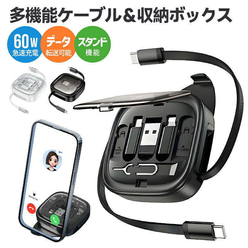 ケーブル&コネクタ収納ボックス 巻き取り式 多機能格納 収納ケース 長さ4階段調整 60W 急速充電 PD/QC対応 変換アダプター付き スタンド機能 スマホ充電ケーブル データ転送 持ち運び便利 Type-C microUSB USB-A SIM取出しピン付 SIMカード収納 便利グッズ 黒 白