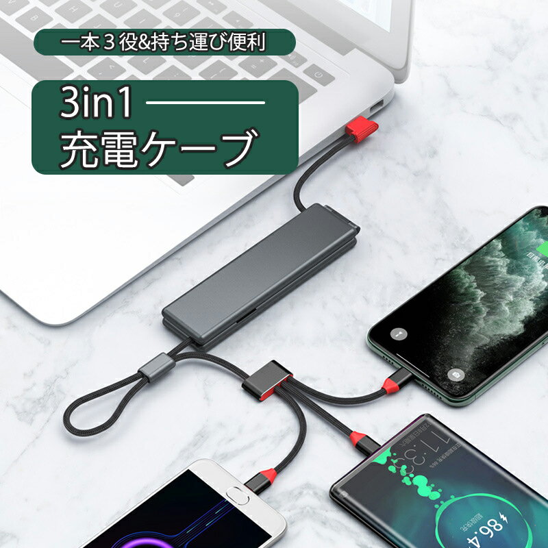 \スーパーセール/3in1 充電ケーブル 片手操作 3A急速充電 高速データ転送 対応マルチケーブル iPhone Android対応 Lightning / Micro USB / USB Type-C 同時充電可 3種類端子 市販上のスマホ全対応 送料無料 在宅勤務 プレゼント