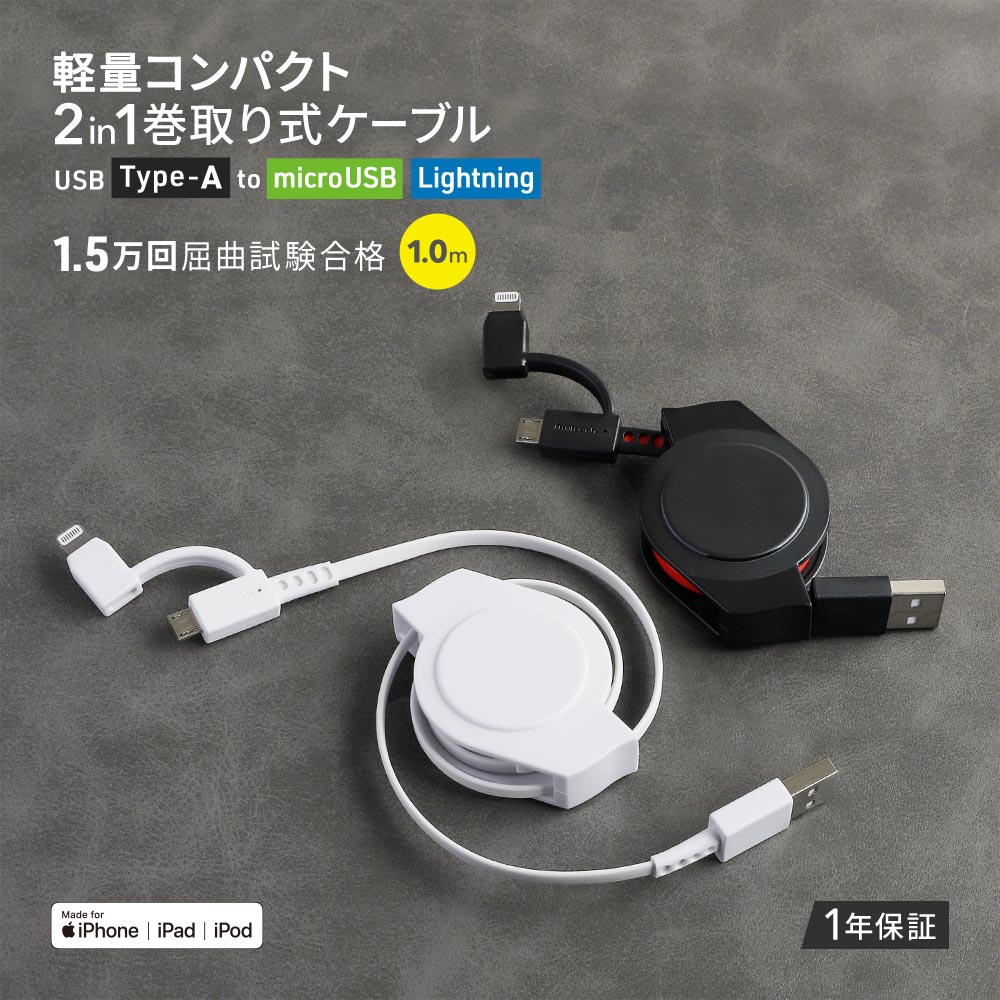 【スーパーSALE価格 12/11 1:59まで】 両引き 巻き取り式 Lightning変換アダプター付き USB Type-A to microUSB 2 in 1 ケーブル 充電 データ転送 1.0m ブラック×レッドホワイト 1年保証 メール便送料無料