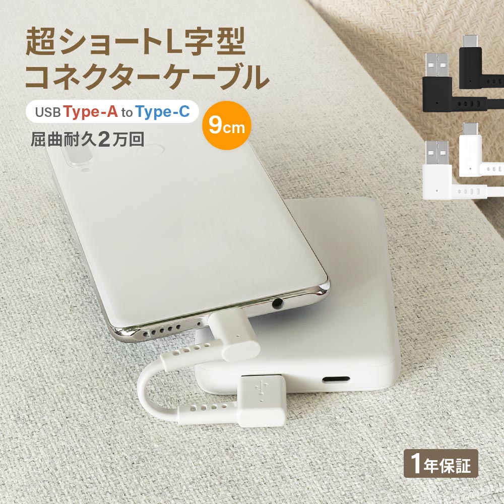 【スーパーSALE価格 12/11 1:59まで】 L字 コネクター 超ショートケーブル USB Type-A to Type-C 約9cm 急速充電3A データ転送 ホワイト ブラック 1年保証 メール便送料無料 【Web限定モデル】