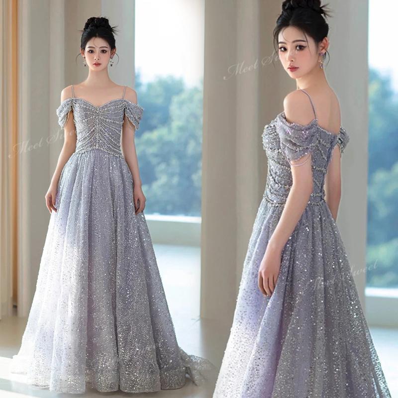 カラードレス グレー オフショルダー 編み上げ キラキラ 二次会 ウェディングドレスドレス 挙式 演奏会 結婚式 音楽会 発表会 大人 トレンド パーティードレス