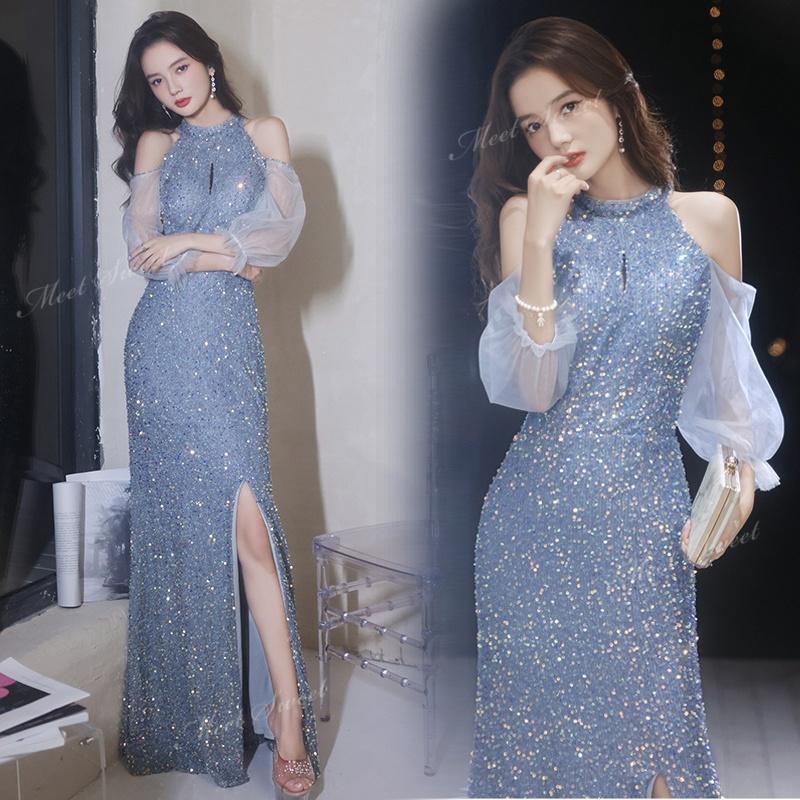 カラードレス ブルー スレンダードレス スリット 袖付き キラキラ パーティードレス ウェディングドレス 演奏会 発表会 結婚式 二次会 花嫁 前撮り トレンド