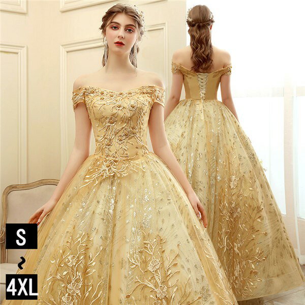 ウェディングドレス ロングドレス パーティードレス ピアノ 発表会 成人式 演奏会用ドレス 5号 7号 9号 11号 13号 15号 ステージ衣装 舞台衣装 花嫁ドレス 編み上げ 刺繍ドレス イブニングドレス オフショルダードレス サイズ指定可 金色グローリーパーク