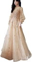 ロングドレス レディース 成人式 演奏会 発表会 パーティー 結婚式 二次会 フレンチ イブニングドレス プリンセス Vネック 七分袖 フレアスリーブ バックリボン ロングトレーン チュール シフォン エレガント ポリエステル シャンパンカラー ロング丈