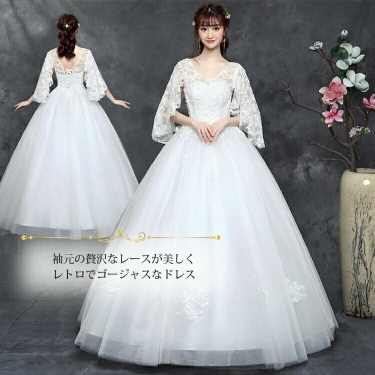 前撮り ドレス【着後レビュー特典】スカート丈が選べる総レース Aライン 袖あり ウェディングドレス 結婚式 花嫁 ドレス カジュアル シルク調 シンプル インポート 大きいサイズ ブライダル パーティ 発表会 前撮り ウエディングドレス
