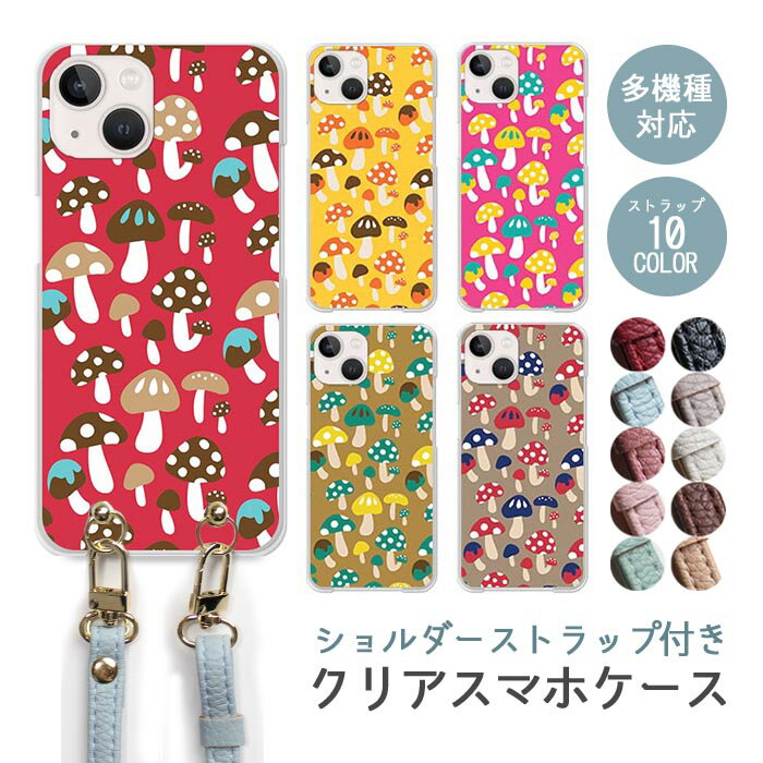 スマホケース ショルダーストラップ スマホストラップ クリアケース ハードケース 透明 キノコ レトロ ポップ iphone17 iphone16e iphone16 iphone15 iphone14 GooglePixel 9a AQUOS wish4 arrows We2 かわいい レディース おしゃれ