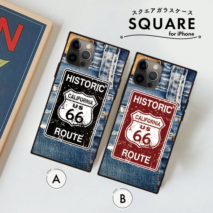 iPhone16 16e 16Pro 16ProMax 16Plus ケース カバー iPhone15 15Pro 15ProMax 15Plus ケース 背面ガラス ケース スクエア 四角 iPhone13 pro 12 Pro 強化ガラス 軽量 おしゃれ スマホケース 韓国 かわいい デニムプリント ルート66 アメリカン