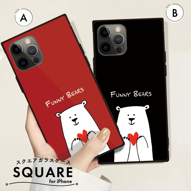 iPhone16 16e 16Pro 16ProMax 16Plus ケース カバー iPhone15 15Pro 15ProMax 15Plus ケース 背面ガラス ケース スクエア 四角 iPhone13 pro 12 Pro 強化ガラス 軽量 おしゃれ スマホケース 韓国 かわいい シロクマ 北欧 ハート ペア おそろい 赤黒