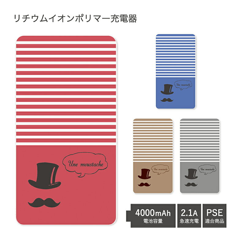 (10%OFFクーポン 4日20:00〜11日01:59) 【PSE適合品】 No137 ヒゲハット 受注生産 急速充電 USB出力 リチウムイオンポリマー充電器 2.1A 4000mAh モバイルバッテリー iPhone Android ボーダー 赤 青 ひげ ユニーク