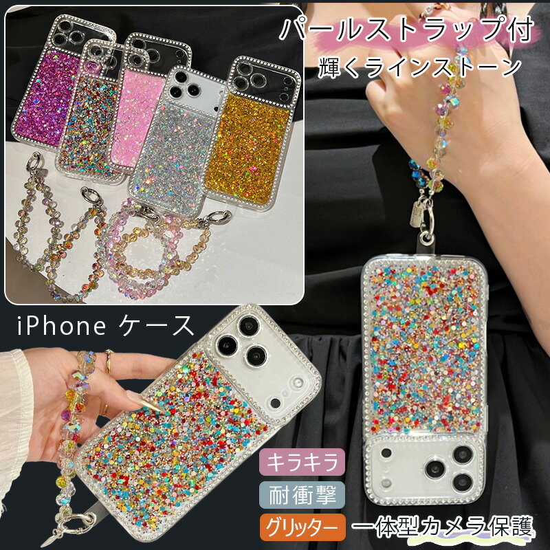 パールストラップ付き iPhone17 iPhoneAir iPhone16e iPhone15 iPhone14 iPhone13 iPhone12 iPhone11 iPhone16 pro max キラキラ 輝く ケース iPhone 16 plusラインストーン ケース かわいい グリッター ラメ入り カメラレンズ保護 スマホストラップ 手首 リストストラップ