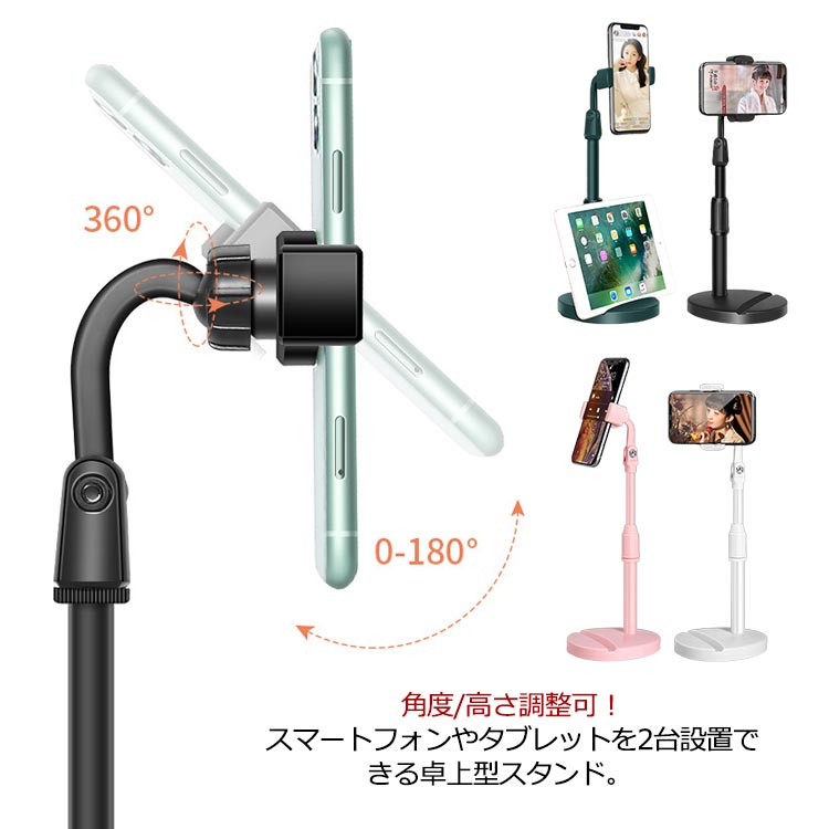 スマホスタンド ホルダー 卓上 タブレットスタンド 携帯スタンド スマートフォン iPhone WEB会議 動画撮影 自撮り スマホホルダー 高さ調整 角度調整 自由自在 360度 軽量 置き型 土台強化 安定 多機種対応