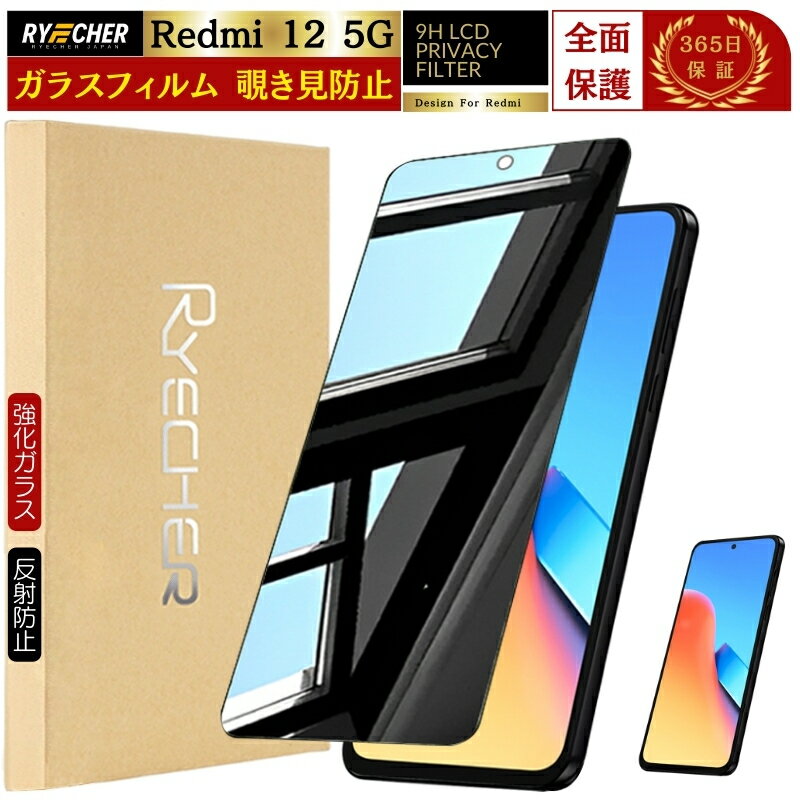 覗き見防止 Redmi 12 5G フィルム ガラスフィルム 保護フィルム Redmi12 5G 覗き見防止フィルム シャオミ ゲーム 黒縁 除き見防止フィルム 覗き防止 保護シート RYECHER JAPAN 液晶保護フィルム
