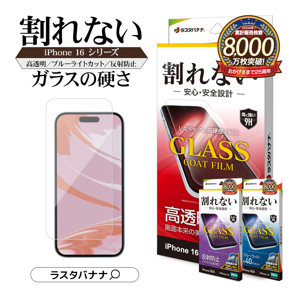 iPhone16 16 Pro iPhone15 フィルム 平面保護 ガラスコート 高光沢 高透明 アンチグレア 反射防止 ブルーライトカット 硬度9H 簡単貼り付け 割れない アイフォン16 保護フィルム ラスタバナナ