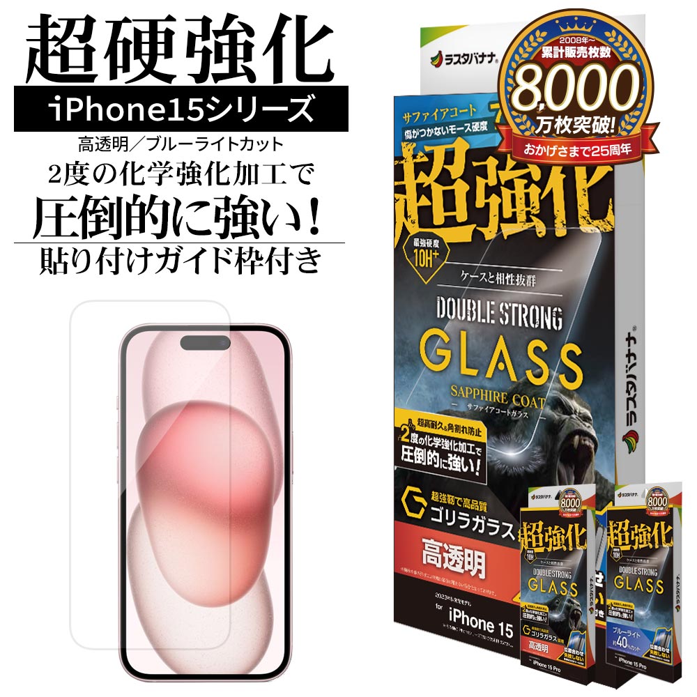 iPhone15 15 Pro ガラスフィルム 平面保護 超強化 ダブルストロング ブルーライトカット 高光沢 高透明 ブルーライトカット サファイアコート ゴリラガラス採用 0.33mm 硬度10H 10H+ モース硬度7 ガイド枠付き アイフォン 保護フィルム ラスタバナナ