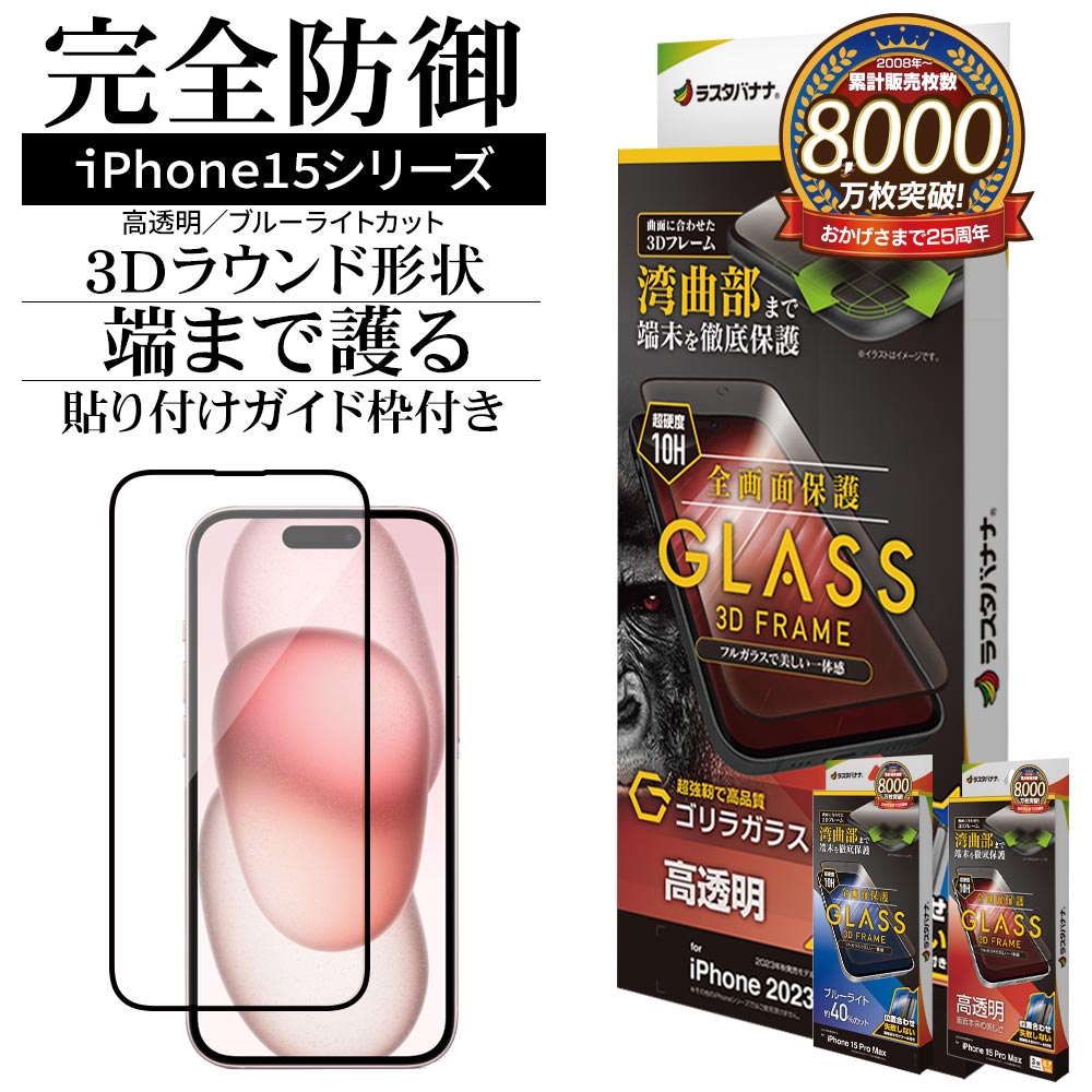 iPhone15 15 Pro 15 Plus 15 ProMax ガラスフィルム 全面保護 3Dフレーム ブルーライトカット 高光沢 高透明 アンチグレア ゴリラガラス採用 0.33mm 硬度10H ガイド枠付き ブラック アイフォン ラスタバナナ