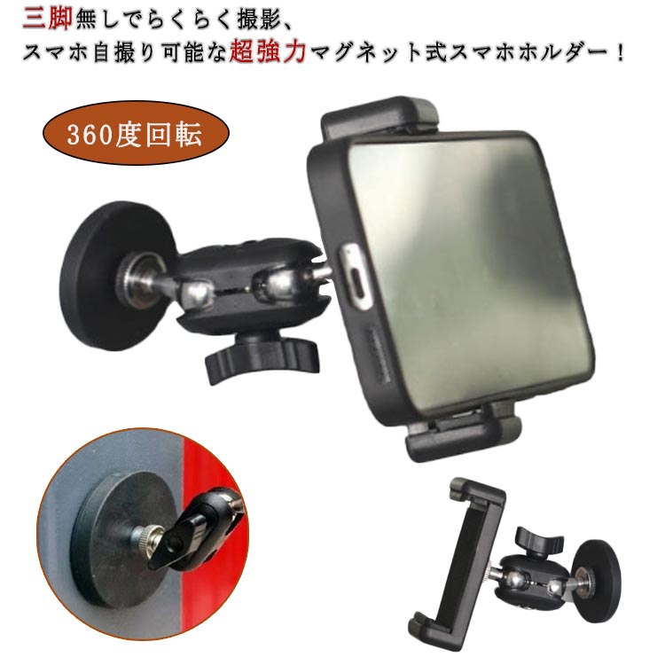 最安値挑戦★即納★マグネット スマホスタンド 三脚不要 全身撮れる 人気アイテム スマホスタンド マグネット スマホホルダー 角度調節 360度回転 三脚無し マグネット式 強力 磁石 磁力 自撮り セルカ 動画 SNS 撮影 車 バイク 固定 屋外 電柱 壁 冷蔵庫 コンパクト