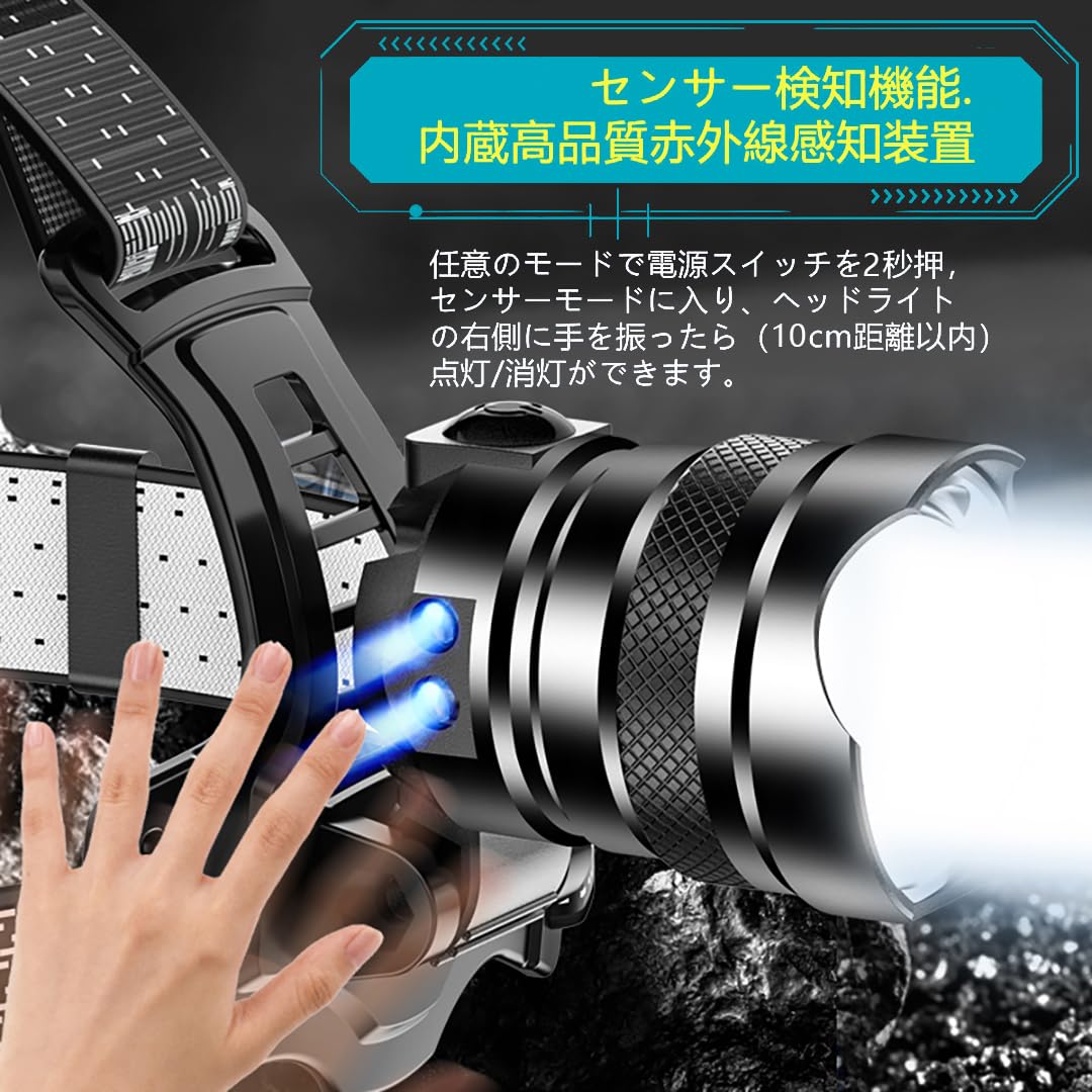 【超高輝度 XHP200 LED ヘッドランプ &軽量】最強の輝度は800000ルーメンです.(絶対目で直視しないでください!)明るさは通常のT6照明の約20倍です。L2の10倍です、P70の7倍です.照射距離は遠くて夜間に1500メートル以内の物体に焦点を合わせることができます。寿命は300,000時間です。大型レンズを採用し、絞りが大きく照射距離が遠い。点灯時間は低輝度で30時間、高輝度で15時間に達ます。充電で繰り返し使用でき、電池切り替えの手間が不要で、経済的です。この明るさなら夜の散歩や暗い場所での活動に大活躍。地震、災害や突然停電した時にも役立ちます。【Type-C急速充電+過充電保護】超高輝度ヘッドライトには2つの大容量の充電可能な18650 バッテリーが付属しており、充電式ヘッドランプはType-C充電ケーブルで充電可能です、僅か7時間で完全充電となり、。充電中:赤色指示灯点灯、充電完了:緑色指示灯点灯。充電完了の場合、充電停止してください。過充電保護ICが内蔵されています。 また、長時間着用時に重さも気になる感じる場合は1本のバッテリーを取り出して軽量化になり、明るさ変わらず!攻撃ヘッドはアルミ合金のデザインで、衝撃に強く丈夫で耐久性が強いです,2メートルの耐衝撃性、耐久性も最高です。 ヘッドバンドの素材を完全にアップグレード 。ヘッドバンドの裏側には起毛加工、やわらかな肌へと導きます。 快適さを向上させます。 高弾性のヘッドバンドは、通気性と調整可能な弾性を備えています。長時間ヘッドに着用しても疲れません。【センサー検知機能+90°角度調整+テール警告灯】任意のモードで電源スイッチを2秒押,、センサーモードに入り、側面にセンサーが搭載して、内蔵高品質赤外線感知装置、ヘッドライトの右側に手を振ったら(10cm距離以内)点灯/消灯ができます。暗い場合における釣り、自動車修理などでも便利です。汚れた手で触る必要はありません。90°の角度を自由に調整でき,使用環境に応じて適切な照射角度や範囲を調整して危険を回避できる。尾部ledの赤色警告灯のデザインは、后ろの歩行者や車両に気付かれやすく、夜間旅行はより安全です。【IPX65防水+無段階ズーム機能+3点灯モード+多様な使用方法】 IPX65防水グレードは、大雨にも安心して対応できます。ランプヘッドを伸縮して、焦点距離を変更します。光斑サイズ、光照射の距離(照明距離:1500メートル)と明るさを勝手に調節して。3つの点灯モード(強、弱 、SOS)がありますので、スイッチを押すごとに適切なライトモードを選択して、簡単にモードを切り替えます!危険な作業には、ヘッドライトをヘルメットに取り付けることができます。 キャンプ、夜釣り、自転車ライト、登山、停電、防災、地震対策、車のメンテナンス、読書、その他の家庭用照明で広く使用されています。