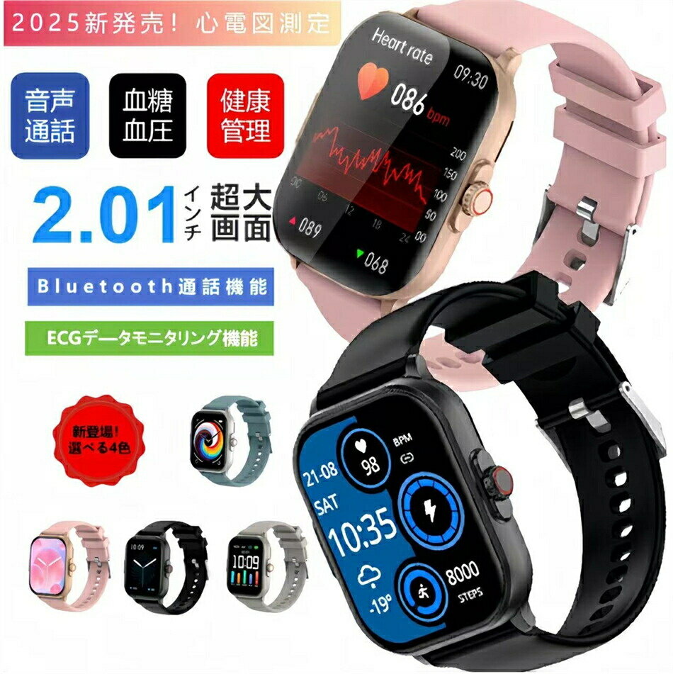 ★半額★【在庫処分/タイムセール 】スマートウォッチ 心電図 ECG PPG 通話機能 血糖値 血圧 血中酸素 心拍数 日本製センサー 日本語 iphone android 2.01インチ大画面 歩数計 IP67防水運動モード歩数計消費カロリー 睡眠モード腕時計日本語iPhone/Android対応