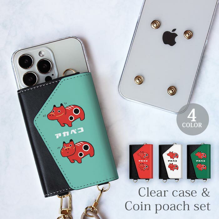 【ポイント5倍】スマホケース ほぼ 全機種対応 スマホショルダー iphone クリアケース と コインケース セット 赤べこ 赤い牛 あかべこ 福島県 郷土玩具 ショルダー タイプ 取り外し 財布 ポーチ 小銭 メンズ レディース ショルダーストラップ ハードケース