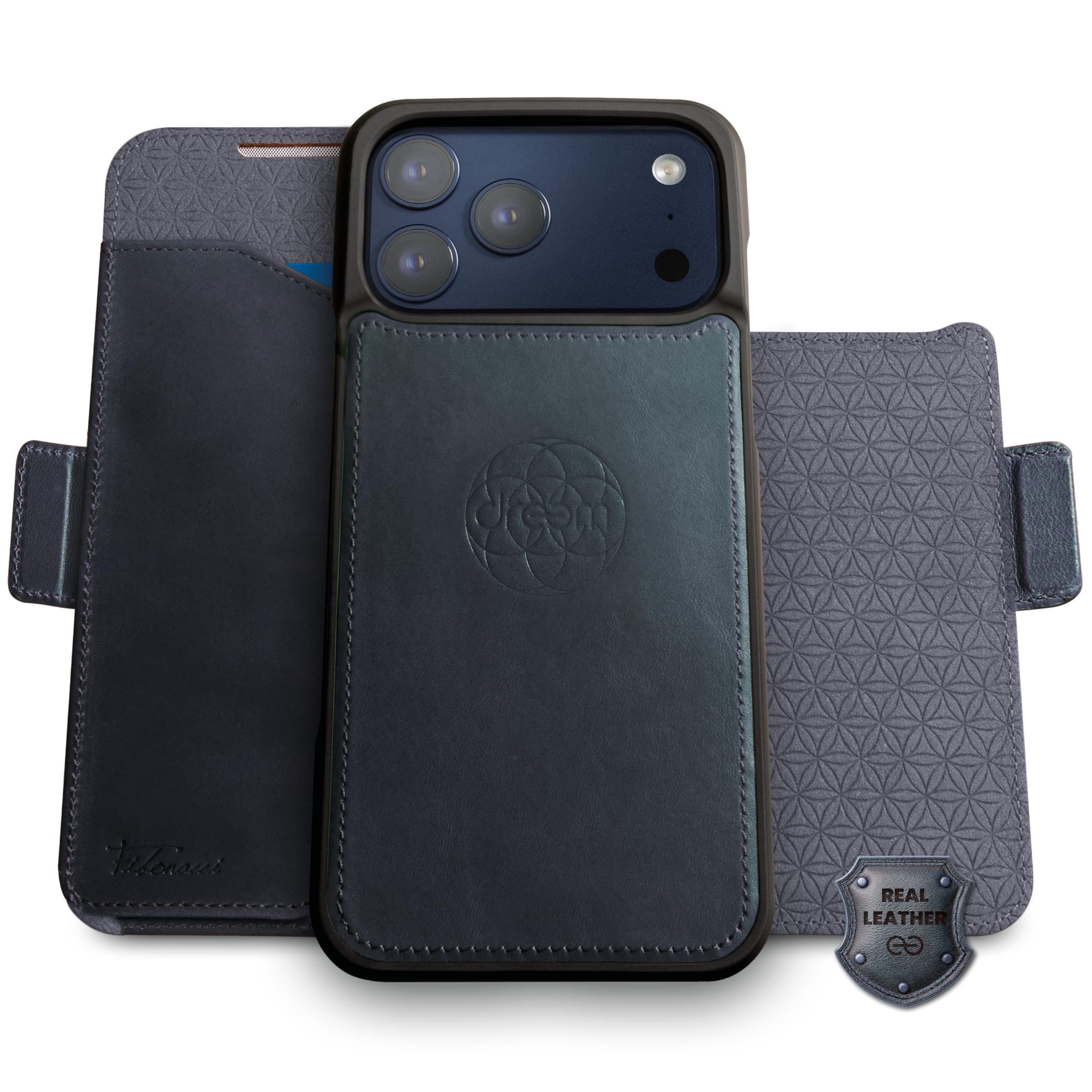 Dreem Real Leather for iPhone 17 Pro Case Wallet, Revolutionary Phone Stand, MagSafe-Fit, Magnetic Detachable Flip Cover, RFID Blocking Card Holder, Gift-Box [Fibonacci:Graphite Blue]