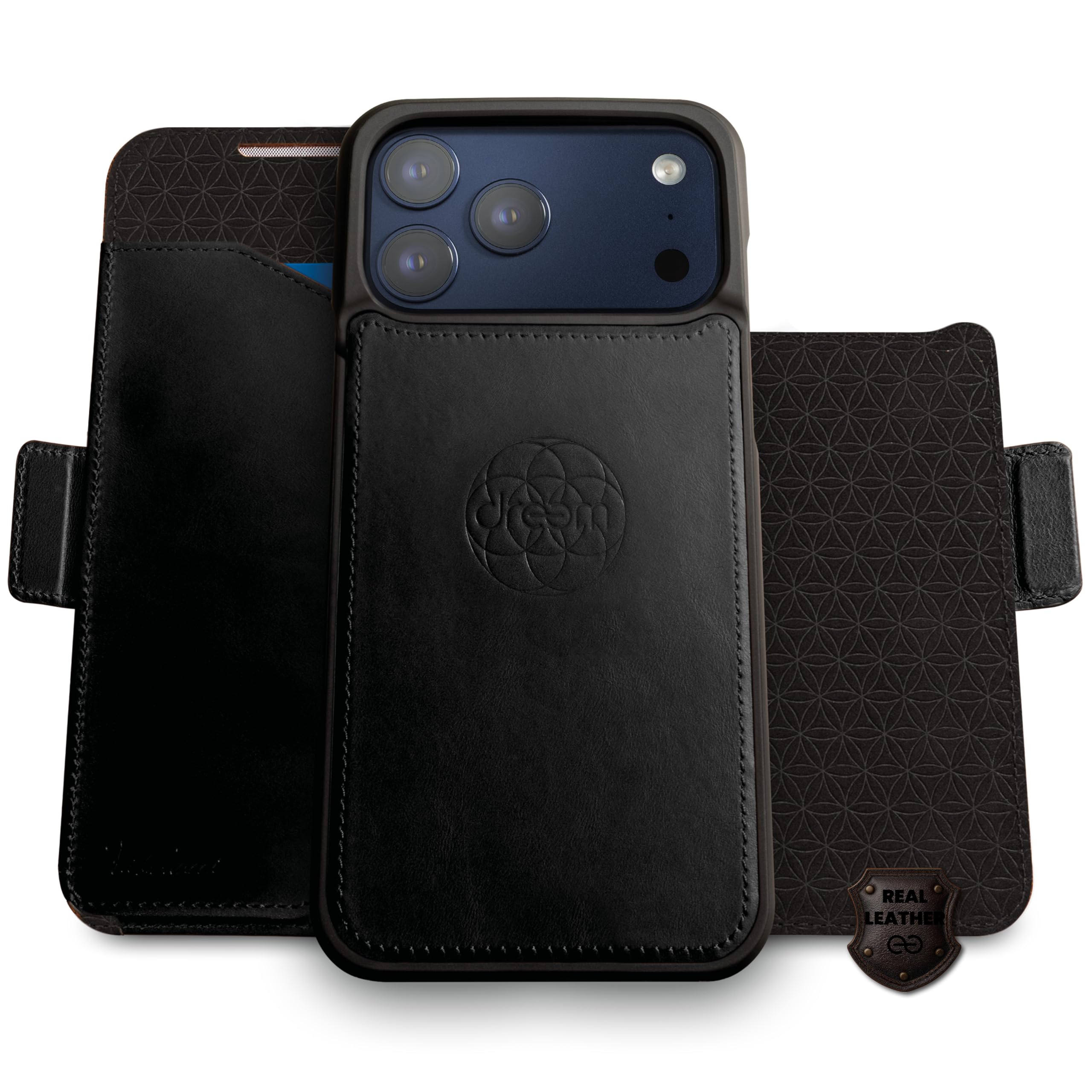 Dreem Real Leather for iPhone 17 Pro Max Case Wallet, Revolutionary Phone Stand, MagSafe-Fit, Magnetic Detachable Flip Cover, RFID Blocking Card Holder, Gift-Box [Fibonacci:Black]