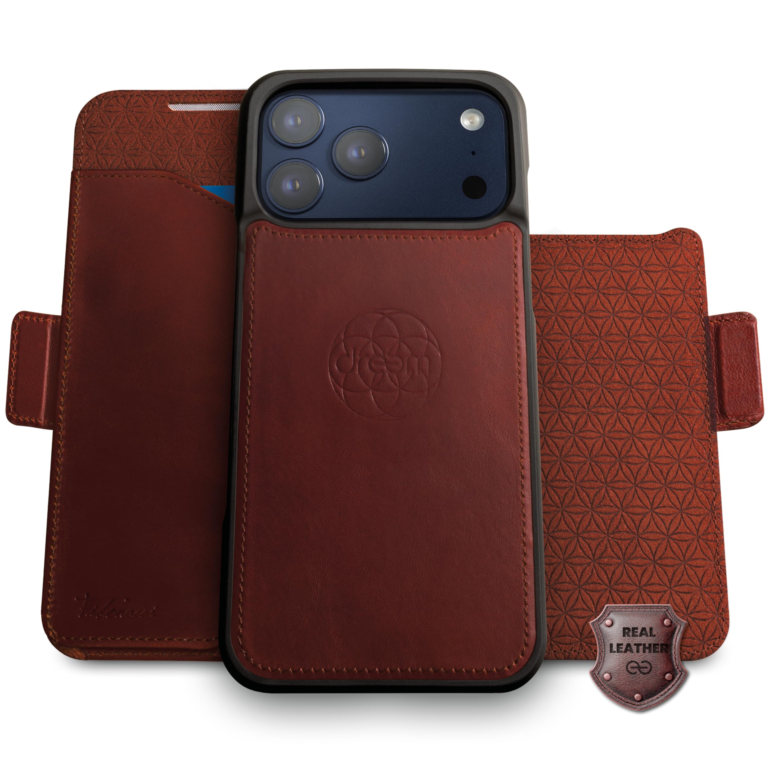 Dreem Real Leather for iPhone 17 Pro Case Wallet, Revolutionary Phone Stand, MagSafe-Fit, Magnetic Detachable Flip Cover, RFID Blocking Card Holder, Gift-Box [Fibonacci:Chestnut]