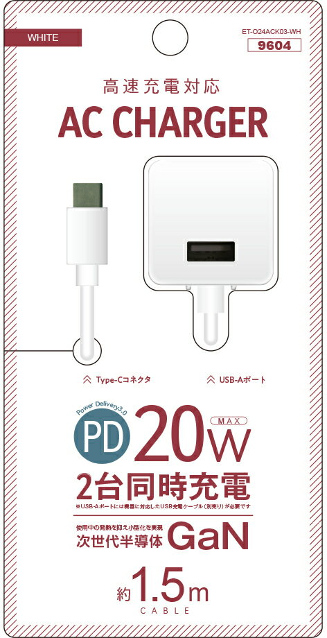 ・Type-C(PD: Power Delivery3.0)ケーブルとUSB-A(QC)ポートを備え、2台同時充電が可能・Type-C(PD)接続なら最大20Wの高速充電に対応・接続機器を自動認識して最適な充電ができるSmartIC機能・90°折たたみプラグで持ち運びに便利・次世代半導体であるGaN(窒化ガリウム)ICを搭載。使用中の発熱を抑え、小型化を実現・100〜240V対応なので海外でも使用可能 商品情報 入力AC100V〜240V 50/60Hz 0.8AType‐C出力PD3.0 : DC5V/3A、9V/2.22A、12V/1.67A(最大20W)USB‐A出力DC5V/3A、9V/2A、12V/1.5A (最大18W)C+A同時出力5V/3A (最大15W)コネクタ形状Type‐Cコード長約1.5mサイズW35×H35×D40mm ETO24ACK03WH