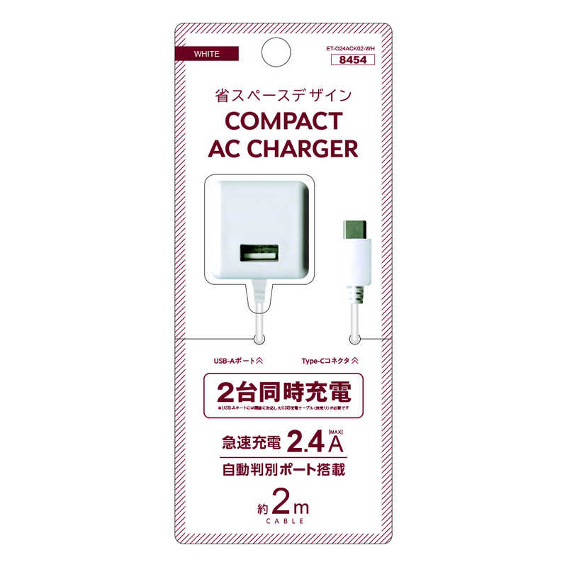 【商品解説】●最大出力2.4AのUSBポート付なので、機器を2台同時に充電できます●USBポートには接続機器を自動判別して最適な充電できる機能を搭載●離れた場所でも充電に便利なコード長さ約2m●コンパクトな設計&折りたたみプラグで持ち運びにも便利●100〜240V対応なので海外でもご使用になれます【スペック】●型式:ET-O24ACK02-WH(ETO24ACK02WH)●JANコード:4531916008454仕様1:■入力 AC100V〜240V 50/60Hz 0.3A■USB‐A出力 DC5V/2.4A(MAX)■Type‐C出力 DC5V/2.4A(MAX)■サイズ W35×H35×D35■重量 約74gこの商品は宅配便でお届けする商品です出荷可能日から最短日時でお届けします。※出荷完了次第メールをお送りします。配送サービス提供エリアを調べることができます「エリア検索」をクリックして、表示された画面にお届け先の郵便番号7桁を入力してください。ご購入可能エリア検索お買い上げ合計3,980円以上で送料無料となります。※3,980円未満の場合は、一律550円(税込)となります。●出荷可能日から最短日時でお届けします。(日時指定は出来ません。) ※お届け時に不在だった場合は、「ご不在連絡票」が投函されます。 「ご不在連絡票」に記載された宅配業者の連絡先へ、再配達のご依頼をお願いいたします。●お届けは玄関先までとなります。●宅配便でお届けする商品をご購入の場合、不用品リサイクル回収はお受けしておりません。●全て揃い次第の出荷となりますので、2種類以上、または2個以上でのご注文の場合、出荷が遅れる場合があります。詳細はこちら■商品のお届けについて商品の到着日については、出荷完了メール内のリンク(宅配業者お荷物お問い合わせサービス)にてご確認ください。詳しいお届け目安を確認する1度の注文で複数の配送先にお届けすることは出来ません。※注文時に「複数の送付先に送る」で2箇所以上への配送先を設定した場合、すべてキャンセルとさせていただきます。