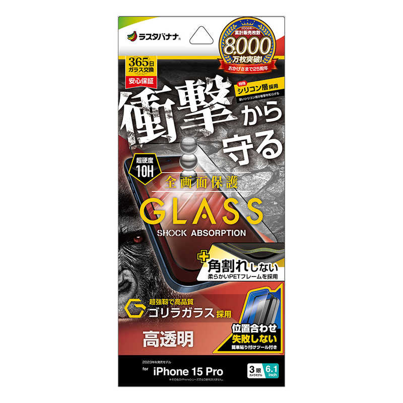 ラスタバナナ iPhone15 Pro 6.1インチ ガラスフィルム 全画面保護 衝撃吸収+角割れしない3Dソフトフレーム ゴリラガラス 高光沢 簡単貼り付け治具付き