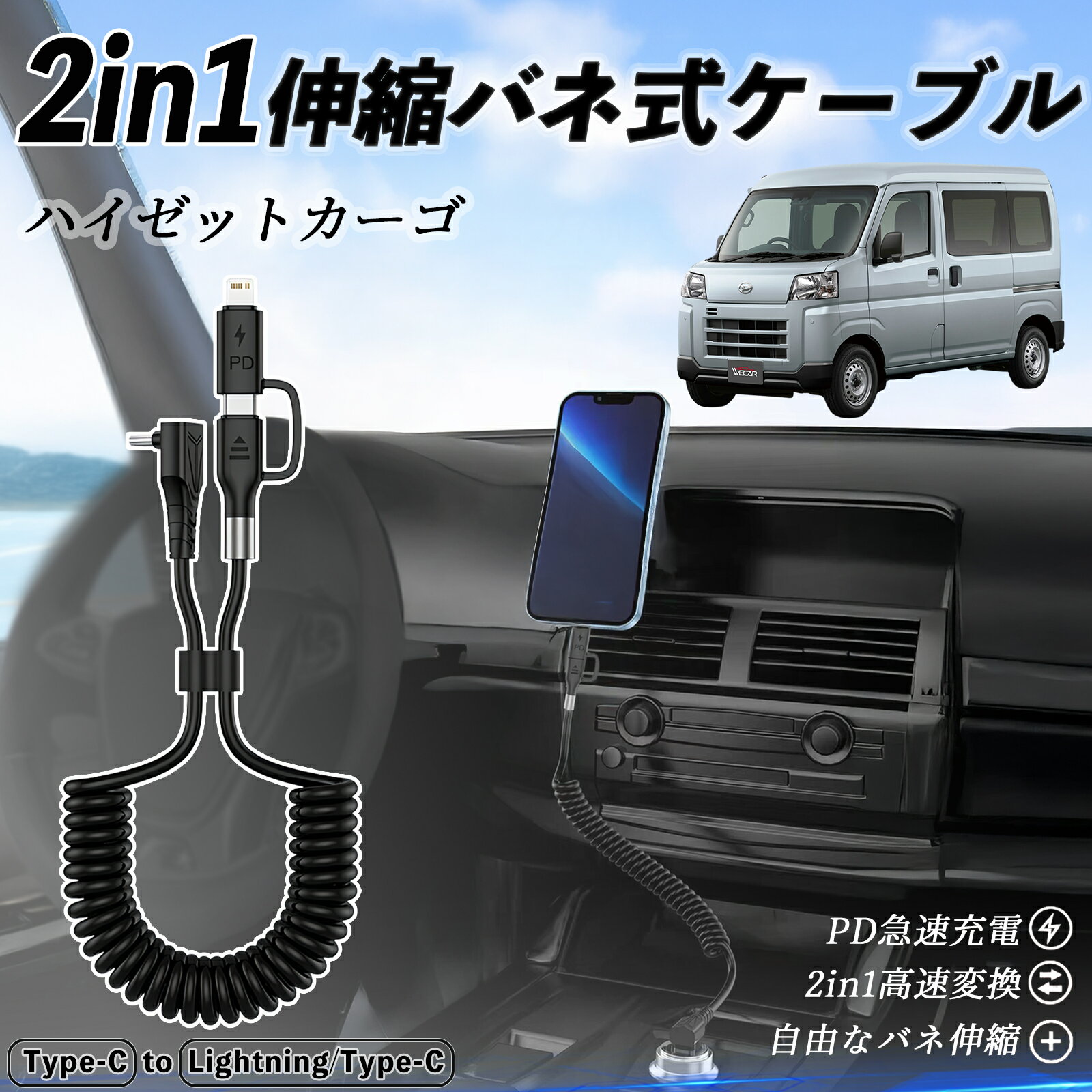 ダイハツ ハイゼットカーゴ 2in1 USB-A USB-C ライトニングケーブル カールコード MFi認証 Apple Carplay Android Auto iPhone 充電ケーブル PD 27W/60W 急速充電 高速データ転送 伸縮 高耐久 ienobenrikan