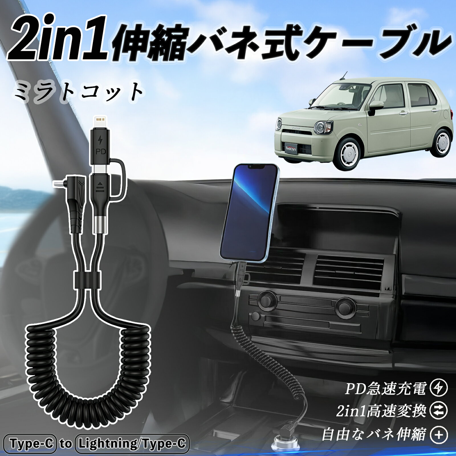 ダイハツ ミラトコット LA550S LA560S 2in1 USB-A USB-C ライトニングケーブル カールコード MFi認証 Apple Carplay Android Auto iPhone 充電ケーブル PD 27W/60W 急速充電 高速データ転送 伸縮 高耐久 ienobenrikan