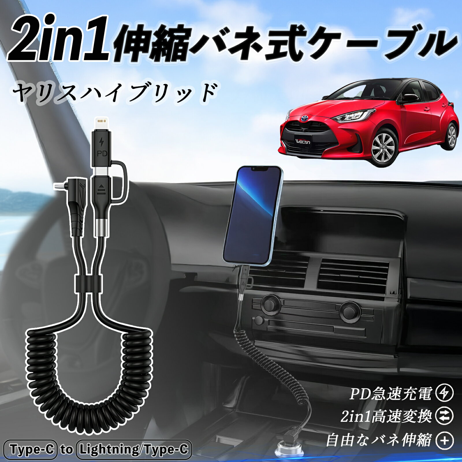 トヨタ ヤリスハイブリッド 2in1 USB-A USB-C ライトニングケーブル カールコード MFi認証 Apple Carplay Android Auto iPhone 充電ケーブル PD 27W/60W 急速充電 高速データ転送 伸縮 高耐久 ienobenrikan