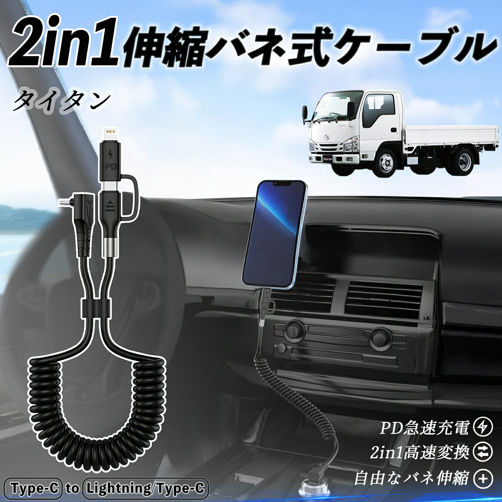 マツダ タイタン 2in1 USB-A USB-C ライトニングケーブル カールコード MFi認証 Apple Carplay Android Auto iPhone 充電ケーブル PD 27W/60W 急速充電 高速データ転送 伸縮 高耐久 ienobenrikan