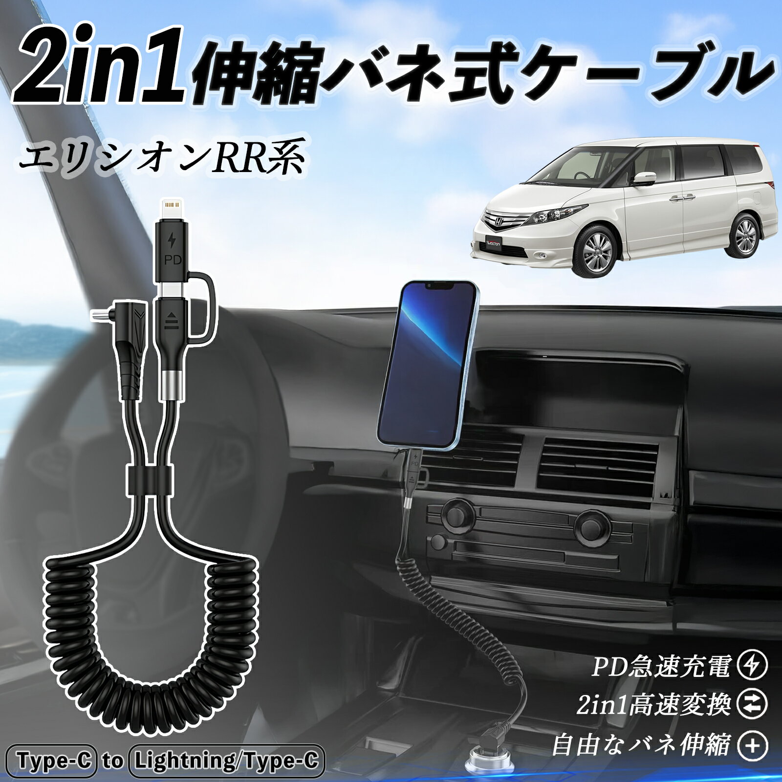 本田 エリシオン?RR1 RR2 RR3 RR4 RR5 RR6 2in1 USB-A USB-C ライトニングケーブル カールコード MFi認証 Apple Carplay Android Auto iPhone 充電ケーブル PD 27W/60W 急速充電 高速データ転送 伸縮 高耐久 ienobenrikan