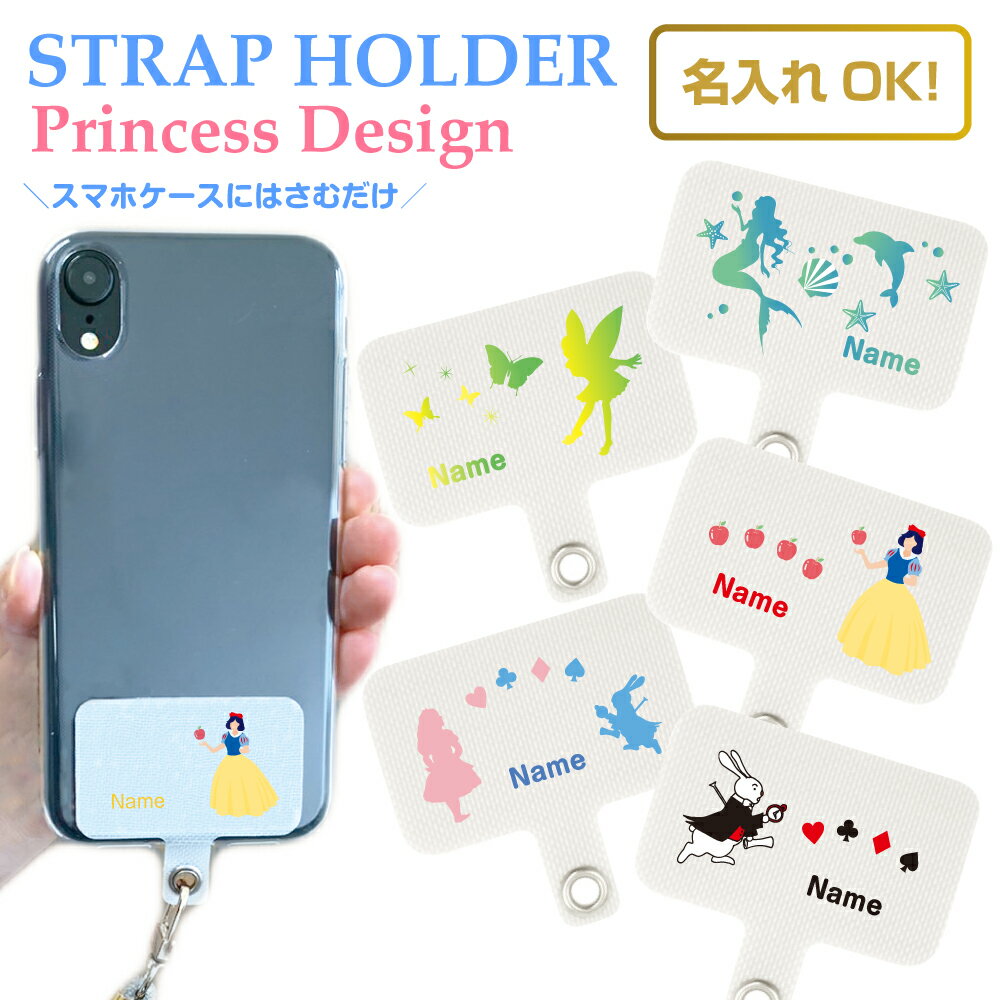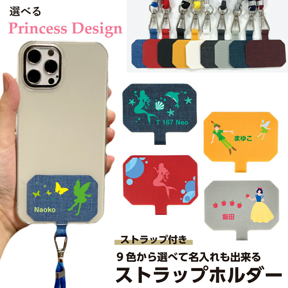 ストラップホルダー スマホショルダー プリンセス 名入れ アリス シンデレラ ティンカーベル マーメイド スノウホワイト オシャレ かわいい プレゼント 選べる10デザイン カラバリ 記念品 ギフト 贈り物 ノベルティ スマホ iPhone ひも付き 紐 赤 黄 青 黒 白 グレー Xperia